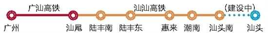 汕汕高铁与广汕高铁、漳汕高铁、福厦漳高铁、温福高铁、甬台温高铁共同构成国家东南沿海高铁通道的甬广高铁,途经广东、福建、浙江三省15个城市,打通大湾区经粤东、海西经济区直达长三角的通道。沿线地市通过350公里高铁连成一体。