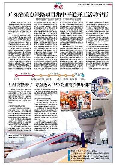 新快报讯 12月26日,随着C1893次列车9时28分从广州白云站发出,汕头至汕尾高铁(以下简称汕汕高铁)汕头南至汕尾段正式开通运营,粤东地区的揭阳、汕头等齐齐迈入“350公里高铁俱乐部”。汕头南至汕尾、广州东、深圳北站间最快分别36分钟、113分钟、109分钟可达。