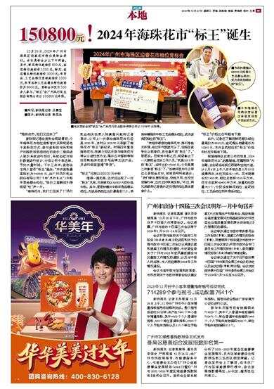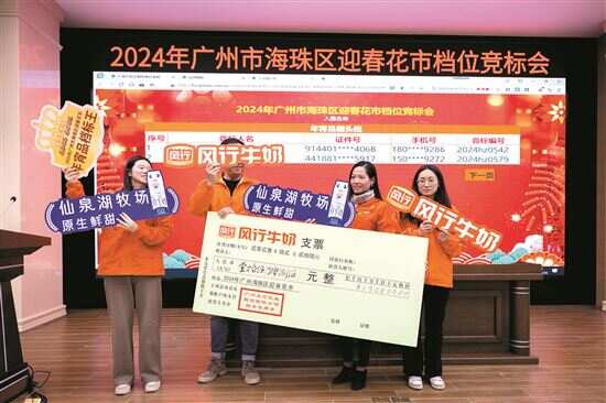 12月26日,2024年广州市海珠区迎春花市档位竞标会举行。本次竞标会分上下午两场,其中,鲜花档位起拍价800元,盆花档位起拍价1200元,鲜花、盆花棚头档位起拍价3000元;年宵品、工艺品档位竞标起拍价1000元,年宵品和工艺品棚头档位起拍价为8000元。竞标会共吸引500余人参与,“标王”由广州风行乳业股份有限公司以150800元夺得。