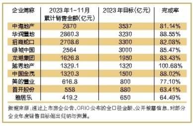 由于销售业绩增长的不确定,越来越多的典型房企在年初时不再公开销售目标,不过从公布销售目标的部分房企群体来看,仍覆盖了从百亿到三千亿元各档区间的成绩单,具有一定参考意义。从1-11月的销售目标完成情况来看,2023年10家披露年度销售目标的典型房企中,7家企业目标完成率已超过80%。其中,越秀地产提前完成全年任务,1-11月累计销售金额为1329.1亿元,完成率为100.68%。仅有2家房企,目标完成率还不及70%。克而瑞研究中心的数据则显示,1-11月累计来看,百强房企业绩同比降低14.4%,年内累计业绩降幅继续扩大,累计业绩同比降低的企业数量超过六成。其中有31家同比降幅高于30%,民营房企占28家。