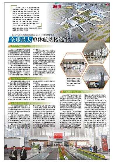 2023年12月31日,白云机场东四西四指廊投运,这标志着T1、T2两座航站楼实现贯通,全球最大单体航站楼正式诞生。启用之后,白云机场新增登机口35个,近机位25个。东四西四指廊将作为T2航站楼的候机指廊使用,旅客的进出港值机及中转旅客手续办理可在T2航站楼完成,东四西四指廊与东五西五指廊无缝连接。另据统计,白云机场2023年累计接送旅客突破6300万人次,实现全国“四连冠”。