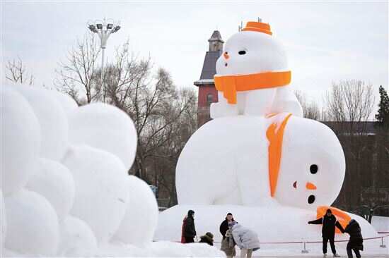 ■元旦,游客在黑龙江哈尔滨太阳岛雪博会园区内游玩、拍照。新华社发
