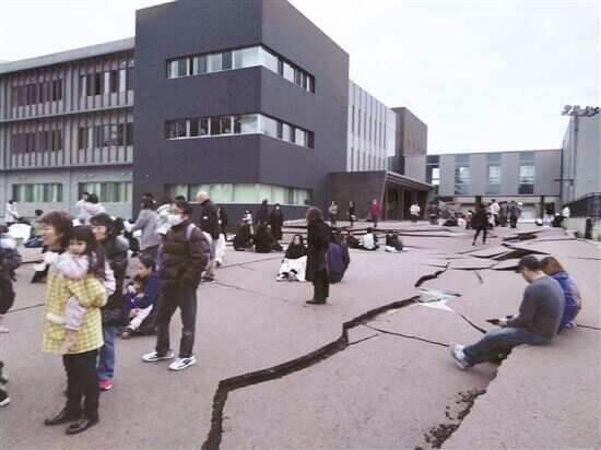 ■1月1日,在日本石川县轮岛市,人们站在被地震破坏的地面上。新华社发