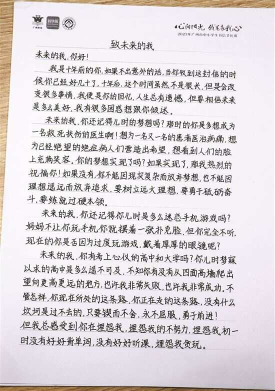 记者惊喜地发现,本次由广州市教育局主办,共青团广州市教育局委员会、广东新快报社和广州市艺术中学联合承办的以“心向阳光·我笔表我心——2023年广州市中小学生书信节比赛”获奖作品中,不少中小学生,已经开始用“给自己写信”的方式,记录自己所思所想,所作所为。他们在一场场与自己的“对话”中反省与深思,在一次次自我心灵探索中成长和蜕变,从而不断认识自我,增长智慧,强大内心,坚定信仰,昂扬向上。