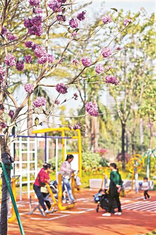 新快报讯 记者李应华 通讯员刘喜冰 王志勇 易鹏报道 冬天的白云,繁花似锦,漫步在白云新城云城西路带状公园,只见紫花风铃木悄然绽放,橙色缓跑径串联起海绵城市科普驿站、非遗民俗廊架、儿童活动区、成人健身区等,让市民游客尽享处处见绿、步步是景的舒适、宜居生活。继白云新城云憩里公园、萧岗海绵探索乐园建成开放后,广州市白云区城市管理和综合执法局打造的白云新城云城西路带状公园于日前全面完工,并对外开放,成为周边市民群众打卡的好去处。
