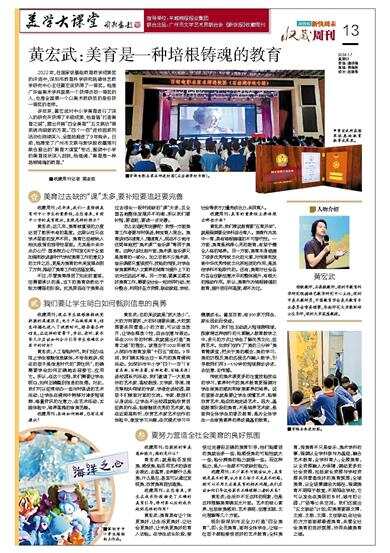 多年来,黄宏武对中小学美育进行了深入的研究并获得了丰硕成果,他首倡“打造美育之城”,提出开展“四全美育”“五文联动”等系统而细致的方案。“四个一百”进校园系列活动也持续深入、全面地推进了9年有余。日前,他接受了广州市文联与新快报收藏周刊联合推出的“美育大课堂”专访,围绕中小学的美育现状深入剖陈,他强调:“美育是一种培根铸魂的教育。”