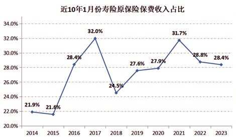 作为“开门红”周期最为重要的一个月,近十年1月份寿险原保险保费的占比情况可以反映其发展历程。新快报记者根据Wind和国家金融监管总局的数据统计发现,1月份寿险保费占比在2014年突破20%,后逐渐升至2017年的高位32.0%,2018年骤降至24.5%。彼时的研究认为,主要因素包括监管推动快速返还型产品下架、其他理财产品收益率提高等。随后,1月份寿险保费占比在2021年反弹为31.7%,2022年跌为28.8%。2023年以前11个月为基数,1月份寿险保费占比为28.4%,在纳入12月份的数据后,上述比例必将稀释,同比下降更加明显。