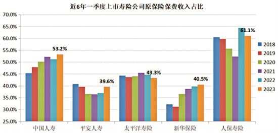 从近六年来看,A股5家上市寿险公司一季度的原保险保费收入仍是举足轻重。总体看,一季度的保费占比最低为新华保险2019年的31.5%,中国人寿和新华保险该指标总体呈上升走势。其中,2023年数据为一季度原保险保费占1-11月总数的比例,全年的占比将低于当前值,中国人寿、平安人寿、太平洋寿险、新华保险、人保寿险分别为53.2%、39.6%、43.3%、40.5%、61.1%。平安人寿和太平洋寿险的该指标近年分别呈反弹和下降趋势。