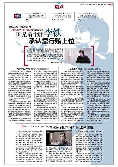 周二晚上,在央视年度专题片《持续发力 纵深推进》第四日的片子里,有关中国足球的反腐内容被报道出来。片子中,国足前主帅李铁承认,他在河北华夏幸福(即河北队)与武汉卓尔(即武汉长江)执教期间,不断通过贿赂对手赢球。而在2019年底竞聘国足主帅期间,李铁也是通过行贿的方式上位。面对央视镜头,李铁说:“我是非常后悔的,做人还是要踏踏实实的,也要走正路。”