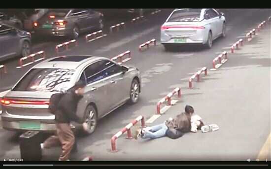 ▲怀抱幼童的女子摔倒在地,幼童后脑着地受伤。 (视频截图)