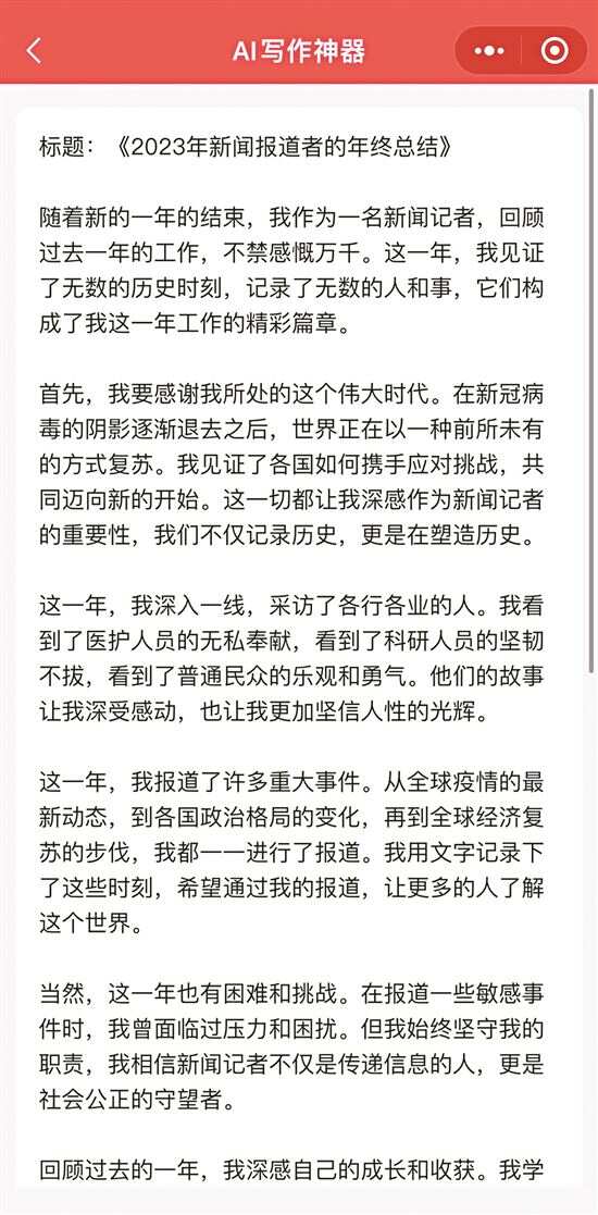 记者在微信小程序里打开一款名为“AI写作神器”的小程序,在对话框内输入“写作一篇新闻记者的年终总结”,在类型和风格方面均不指定,不到2秒,系统自动生成了一篇题为《2023年新闻报道者的年终总结》的文章。从内容上看,通篇行文逻辑清晰,从挑战与机遇、重要事件报道、未来展望等多方面展开,以一种轻松、生动的方式对新闻记者的过去一年进行总结。全文在800字左右,称得上是一篇基本合格的年终总结。