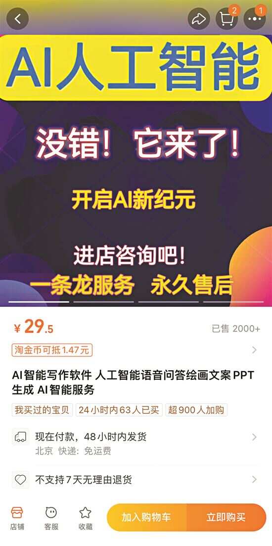 而另一家店铺的“性价比”则显得高了许多,据店家介绍,不管需要多少字数、写几篇,只需要拍下29.5元的链接就能得到一个“永久免费使用”的AI写作软件。用户在领取账户和密码后可以无限期使用,电脑和手机都可以使用,软件会自动生成内容,系统稳定。