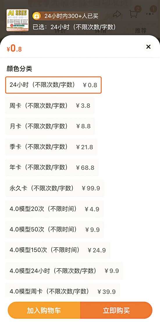记者点进其中一家销量较高的店铺,看到它按照“客户对AI软件的使用需求”罗列了多个产品,有天卡、周卡、月卡、季卡、年卡到永久卡,价格分别为0.8元、3.8元、8.8元、21.8元、68.8元和99.9元,月销量达到1万+,评价内容有好有坏。当记者询问客服是否各行各业的年终总结都可以写时,客服回复:“大部分是可以的,只要输入‘写一篇××职业的年终总结’就可以自动生成。”