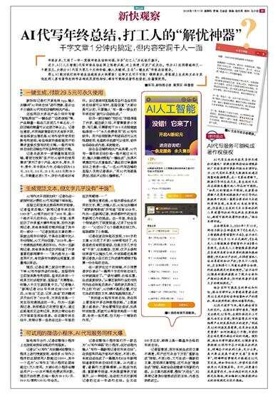 近日,AI(人工智能)代写年终总结在网上悄然兴起,冲上热搜,引发广泛关注。作为AI应用领域的又一个新宠儿,大部分AI代写只要几十元的价格,输入关键词,立马“一键生成”年终总结报告。