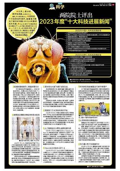●世界上最小的粒子加速器,长度仅为0.2毫米,可以装在笔尖上;●我国首个万米深地科探井,载重能力相当于能同时吊起150头6吨重的成年大象;●OpenAI发布了多模态预训练大模型GPT-4,文字输入限制提升到2.5万字……1月11日,由中国科学院、中国工程院主办、两院院士投票评选2023年中国/世界十大科技进展新闻揭晓。
