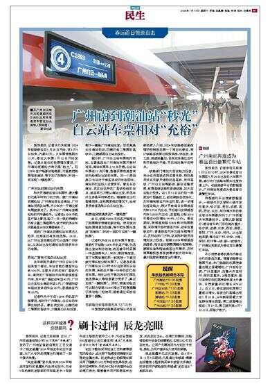 新快报讯 记者许力夫报道 2024年铁路春运自1月26日开始,到3月5日结束,为期40天。火车票预售期为15天,春运火车票1月12日开始发售。记者从首日的抢票情况看到,广州南站到潮汕方向仍是“秒光”。而12306客户端新功能亮眼,可提前把购票信息填好,等于加了购物车,时间一到实现“一键抢票”。