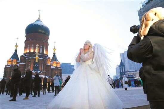 1月12日,游客在哈尔滨建筑艺术广场盛装拍摄写真。哈尔滨的标志性景点之一索菲亚教堂有着百年历史,目前,它所在的哈尔滨建筑艺术广场每天都有许多游客身着盛装拍摄写真,在“冰城”上演冬季浪漫。新华社发