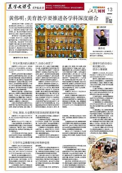 黄伟明是广东省南粤优秀教师、广东省新一轮百千万人才培养工程名教师培养对象、广东省首批美术后备人才培养对象。他在接受广州市文联与收藏周刊联合推出的《美学大课堂》专访时表示,在艺术学科师资严重不足的现实条件下,学校要开齐开足开好美育课程,唯一的出路就是推进学校艺术教育与其他学科教育的深度融合。