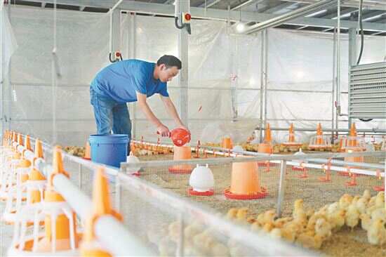 ■平台镇万洞村肉鸡养殖栏舍内,工作人员在给小鸡投喂饲料。