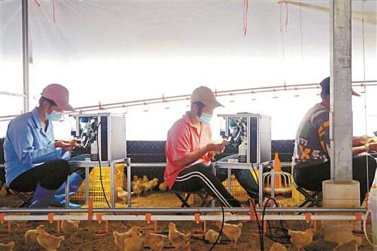 ■平台镇万洞村肉鸡养殖栏舍内,工作人员在给小鸡打疫苗。