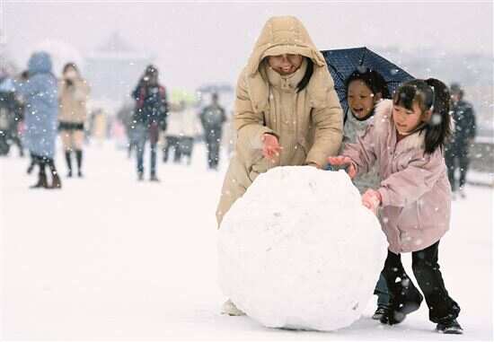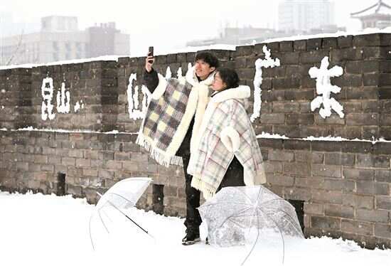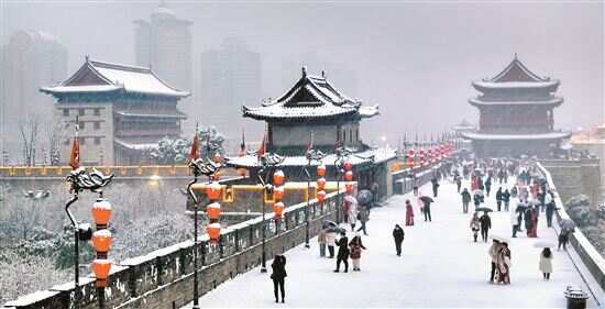 ■1月16日,游客在西安城墙玩雪。 新华社发