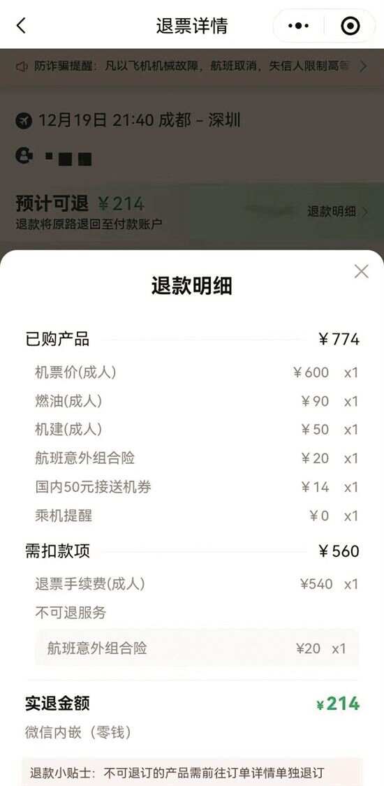 没想到,手机上显示的退款金额却让他惊掉了下巴:788元的机票,在退款明细界面却显示为已购产品774元,退款竟需扣除560元,其中,“退票手续费”就高达540元,还有不可退服务的航班意外组合险20元,到手只剩214元。于是黄先生向客服咨询,在反复沟通后得到的答复是,平台是根据航空公司的退票规则来退款。而黄先生了解到的改签费用,竟比购买此机票的费用还贵。