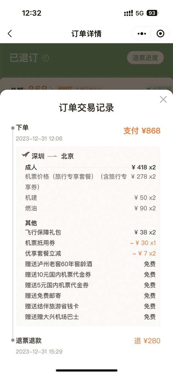 ■倪先生花868元购买的两张机票,退掉后到手只剩280元。