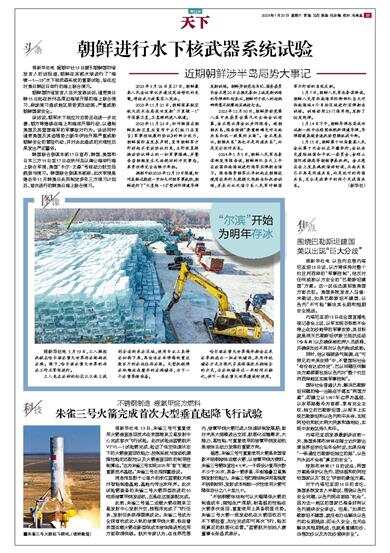 据新华社电 据朝中社19日援引朝鲜国防省发言人的话报道,朝鲜在东部水域进行了“海啸-5-23”水下核武器系统的重要试验,旨在应对美日韩近日举行的海上联合演习。