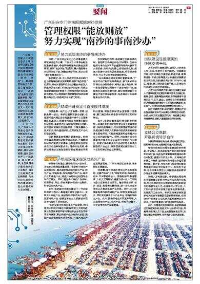 当前,广东正举全省之力办好粤港澳大湾区建设这件大事。广州市人大常委会副主任唐航浩表示,条例明确根据南沙建设发展需要,按照“能放则放”的原则,最大程度将有关权限依法下放,调整由南沙行使,努力实现“南沙的事南沙办”。