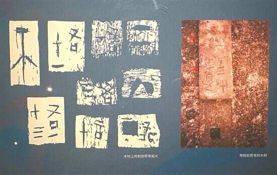 ■木材上的刻划符号拓片,以及带刻划符号的木材。潘玮倩摄于展厅
