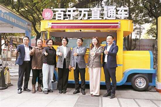 “欢迎大家品尝,现场扫码,送货到家。”一辆黄蓝色调萌趣可爱的“百千万直通车”停在闹市街头,满载着“粤字号”虾先生、湛牌、金华金钩、调顺渔家、大神食品等知名“湛品”,工作队负责人热情邀请市民品尝湛江的地标产品对虾干。