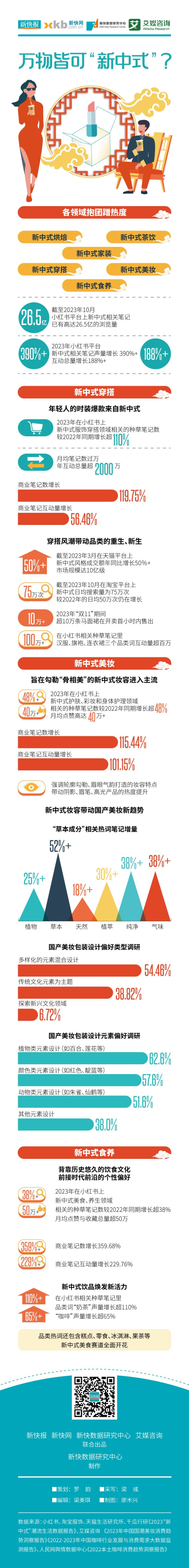 新中式茶饮、新中式烘焙、新中式家装……似乎大家都来沾沾“新中式”的“潮”气,抱团蹭热度。据千瓜行研发布的《2023“新中式”潮流生活数据报告》(以下简称《数据报告》)数据显示,截至2023年10月,小红书平台上“新中式”相关笔记已有高达26.5亿的浏览量。2023年小红书平台“新中式”相关笔记声量增长390%+,互动总量增长188%+,热度高涨。