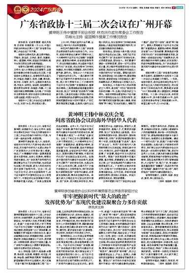 黄坤明指出,2023年是全面贯彻落实党的二十大精神的开局之年,也是广东改革发展历程上具有里程碑意义的一年。习近平总书记亲临广东视察,赋予广东在推进中国式现代化建设中走在前列的使命任务,极大振奋全省上下奋进新征程的信心决心。在习近平总书记、党中央坚强领导下,在包括各位委员在内的全省干部群众共同努力下,广东现代化建设迈出坚实步伐。新的一年,希望广大政协委员坚持“两个确立”,做到“两个维护”,更加紧密地团结在以习近平同志为核心的党中央周围,坚持用习近平新时代中国特色社会主义思想凝心铸魂,牢牢把握推进中国式现代化这个新时代“最大的政治”,坚持大团结大联合,努力为广东现代化建设凝聚合力多作贡献,推动全省上下形成心往一处想、劲往一处使,共同建设现代化的良好局面。要奋力推进科技自立自强,带头组织发动和吸聚更多科技人才积极参与我省科技创新和产业发展,聚焦关键核心技术攻关,生产更多“根技术”,解决更多“根问题”,努力让创新落到企业上、产业上、发展上,为建设科技创新强省、制造强省贡献更多力量。要助力广东尽快补齐城乡区域发展不平衡这一现代化建设最突出短板,带头积极投身“百千万工程”,把自身的工作和资源链接到县镇村,组织动员各方力量资源投入到县镇村,推动县镇村持续增强内生发展动力,加快改善城乡面貌,让企业有钱赚、群众得实惠、方方面面有奔头。要持续擦亮绿色发展这一现代化建设的鲜明底色,带头深度参与绿美广东生态建设,身体力行植绿护绿兴绿,积极推动减污降碳协同增效,拓宽绿水青山转化为金山银山的有效路径,努力在植树造林、环境治理、生态修复、绿色低碳等方面贡献智慧力量、形成示范效应,带动广大群众共筑绿色美好家园。省委将一如既往支持政协和广大委员履职尽责,为大家开展工作、发挥作用创造有利条件。