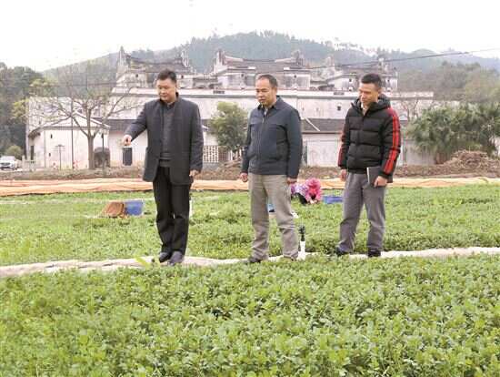■清远市阳山县七拱镇党委书记林耀雄(左一)和驻镇工作队队长蒋胜良(中)查看旱地西洋菜示范基地。