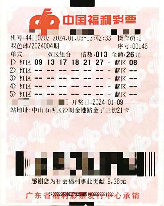 新快报讯 记者陆妍思 通讯员黄英杰报道 1月9日晚,双色球第24004期开奖,当期中山中得13注二等奖,总奖金约182.8万元。经检索,售出该彩票的是位于中山市西区沙朗金港路金子三街21卡的44110202福彩销售站点,中奖彩票为一张26元1注号码13倍倍投的机选彩票,这是中山彩民2024年收获的首个100万元以上福彩大奖!