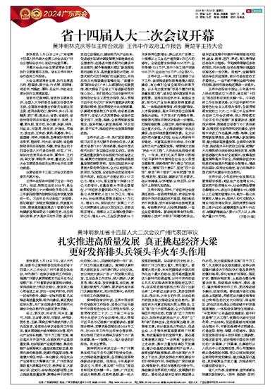 新快报讯 1月23日下午,省人大代表、省委书记黄坤明参加他所在的省十四届人大二次会议广州代表团全体会议,与代表们一起审议省政府工作报告,强调广州要认真贯彻落实习近平总书记视察广东、广州重要讲话重要指示精神,保持战略定力和历史耐心,激发向上雄心和奋进之志,抓住一切有利时机,利用一切有利条件,调动一切有利因素,扎实推进高质量发展、现代化建设,真正挑起经济大梁,为广东在推进中国式现代化建设中走在前列作出新的更大贡献。