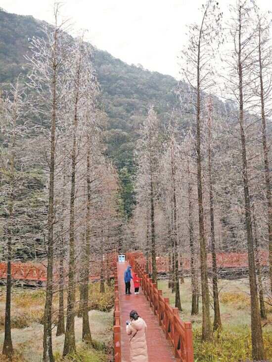 新快报讯 记者王彤 通讯员罗丽芬 林园轩报道 树枝、树叶、屋檐、栏杆都裹上一层薄薄的“白纱”,曾屡次入冬失败的广州,终于迎来有冰的冬天。1月23日,受本轮寒潮影响,广州石门国家森林公园内的花草树木出现冰挂,披上了银装,公园为游客带来了一场视觉盛宴。游客在景区各处打卡拍照,记录下这难得一见的场景。