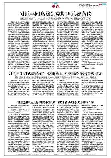习近平指出,32年前,乌兹别克斯坦在中亚国家中率先同中国建交,两国人民传承丝路精神,中乌友好大树根深叶茂,生机勃勃。特别是过去7年多来,我们共同引领两国各领域合作呈现蒸蒸日上的良好局面。建设一个更加富有内涵和活力的中乌关系,是两国人民的共同期盼。双方要以发展新时代全天候全面战略伙伴关系为契机,以高水平政治互信筑牢中乌命运共同体的根基,以高质量共建“一带一路”助力中乌推进各自现代化事业。