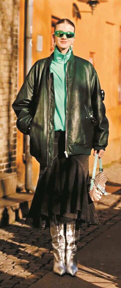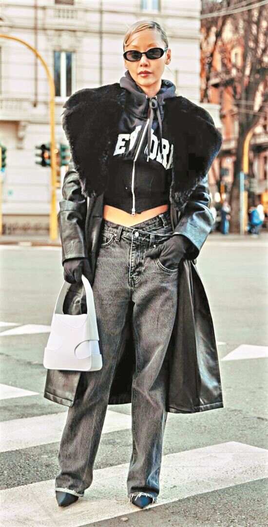 浮夸大翻领加入休闲或运动风单品,平衡华丽感,弱化臃肿感。