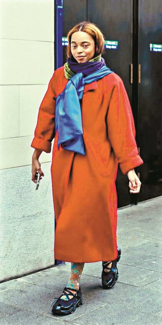 围巾或丝巾叠在大衣上,小面积存在即使用色复杂也不会显得过于繁复。