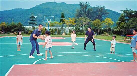 ■林楷彬(右三)到白马小学,与学生打球互动。