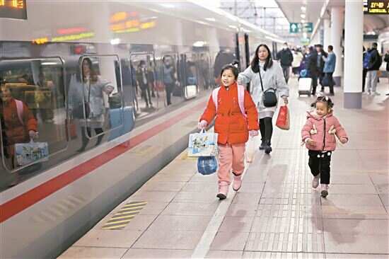 ■在广州火车站,两个孩子跟着妈妈一起进入站台,奔跑着前往自己所在的车厢。