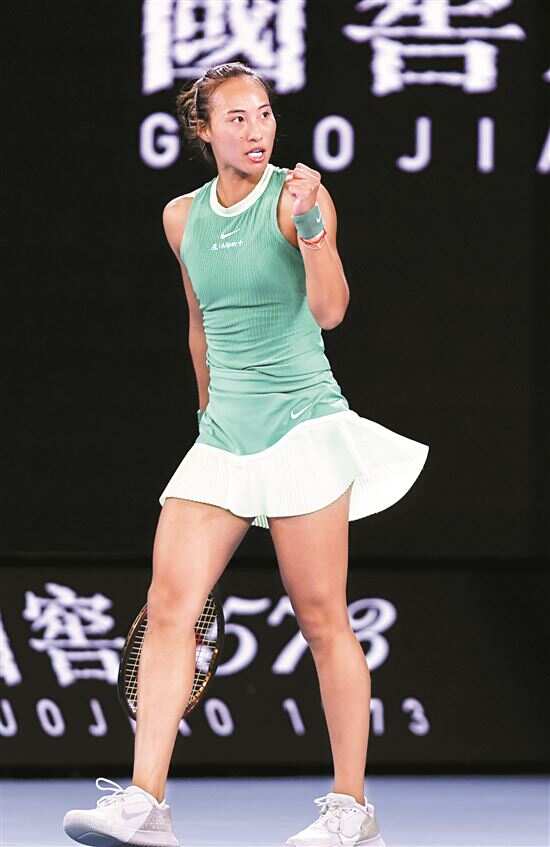 ■1月25日,郑钦文晋级澳网女单决赛,庆祝得分。新华社发