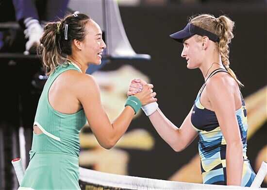 ■1月25日,郑钦文(左)与雅斯特雷姆斯卡握手致意。新华社发