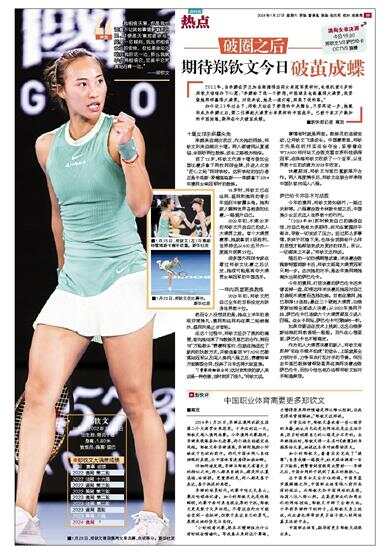 2014年1月25日,李娜在澳网收获生涯第二个大满贯女单冠军。十年后的这一天,郑钦文闯入澳网决赛。今年澳网比赛期间,李娜来现场参加元老赛,两个湖北姑娘完成同框。郑钦文夸李娜漂亮,李娜则勉励小师妹放下包袱向前冲。两代中国女网人自信洒脱的表现,令中国体育迷看得如痴如醉。