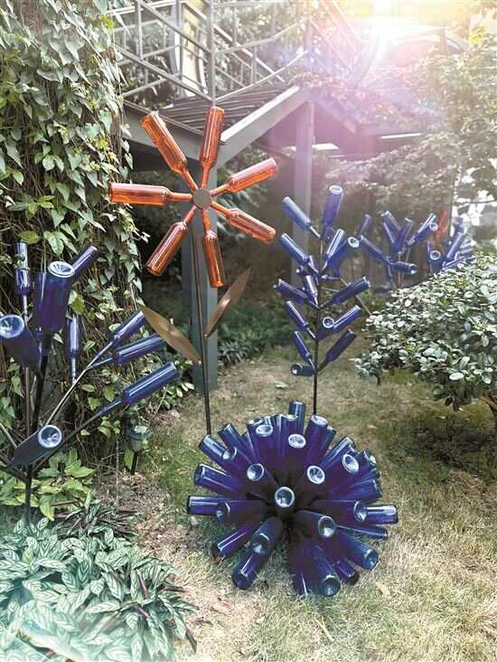 其中,“低碳公共艺术作品”包含四大作品系列,例如:“瓶”行世界——塑料瓶子的艺术化升级设计;鱼跃龙门——园林工具的再利用和设计;生命之水——塑料瓶子的灵动元素;花飞蝶舞——园区的动植物生动形态。