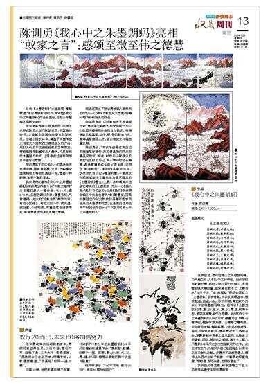陈训勇说:“本次活动是在我自己的画室展厅进行,来的都是我的师友及最基层的区、街道、村的书记领导以及我的出生村的书记、我小学母校校长等等,都是看着我成长的父老乡亲,这符合‘蚁道蚁行’。蚂蚁作品诞生20年,这次我收到了五份重要礼物:一是原文化部副部长王文章先生为展览题名的《上善若蚁》墨宝;二是广东岭南美术出版社寄来的《上善若蚁·万众一心》编入美术教科书的证书;三是《美术》杂志原主编王仲先生也寄来《蚁魂》墨宝;四是中国画创作研究院我历届高研班学员送来的大蛋糕和花篮;五是我自己用近两年时间创作的342平尺巨作《我心中之朱墨朗蚂》。”