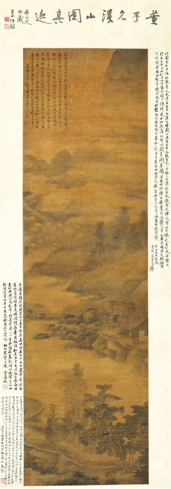 赏析:此图是双拼巨幅的左半幅,所以构图不是完整的。画上有清代画家恽寿平题跋,他认为这是黄公望的真迹,甚为爱重。鉴定家谢稚柳认为,虽然黄公望学画较晚,但不会一幅早年作品都没有流传下来,他认为此幅《溪山图》便是黄公望早期作品。“它的表现与晚期的不同,在于不是清空而是迫塞满纸的情景,不是简括而是繁复的描绘,不是深沉炼气于骨的而是温润柔和的笔,不是精简地惜墨如金而是一片湿晕的墨痕。”(谢稚柳《元黄子久的前期画》)谢氏还指出王时敏、恽寿平他们都学黄公望,虽然所追求的是黄公望晚年风貌,但还带着黄的前期温润的气味,应是从类似这种早期作品而来。