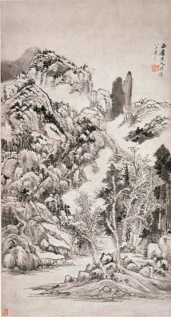 赏析:此画为王时敏83岁所作,虽然他说自己晚年“目昏腕弱”,但观此作,运腕虚灵,随意挥洒,山中草木以粗笔重墨点画,浓淡干湿对比强烈,尽显其苍润疏秀的笔墨特色,极具浑厚华滋的艺术韵味。