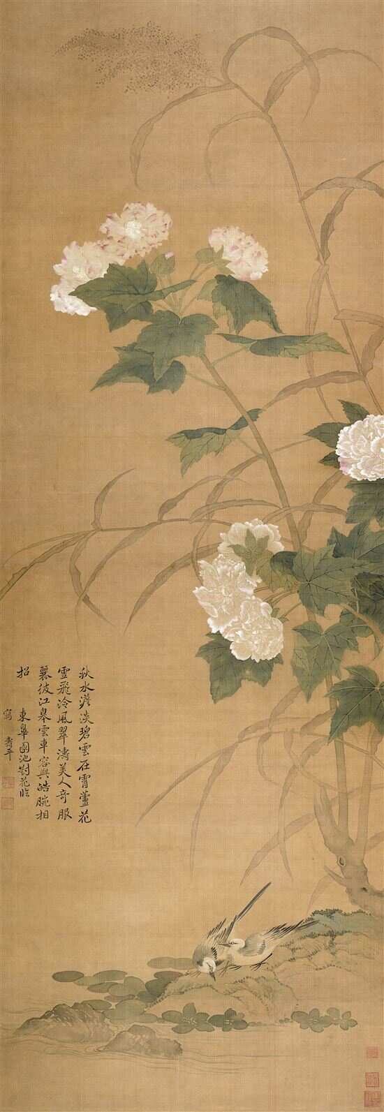 赏析:此图恽寿平以淡彩绘芦苇和衬景,烘托出芙蓉花娇妍的色彩;花朵染色轻透,再以白粉和粉色点染和勾勒,将花瓣轻纱般的质感表现得极为逼真;而芦苇和芙蓉的叶子则以没骨法写就,工写结合,充分展现了恽寿平高超的写生技艺,真真是“直逼天然”。